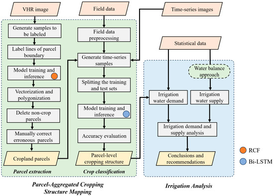 Flowchart of the proposed three-step method used to analyze irrigation-water supply and demand. Step 1 is parcel-aggregated cropping structure mapping; step 2 is irrigation analysis.