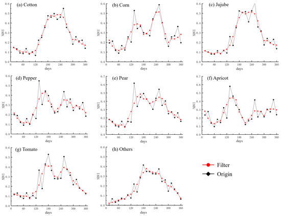 Growth curves of different crops. The black line denotes the original curve, while the red line illustrates the smoothed outcome obtained by applying the Savitzky–Golay convolution smoothing algorithm to the original curve. (a–g) corresponds to seven major crops in the study area, and (h) is the average curve for the other crops.