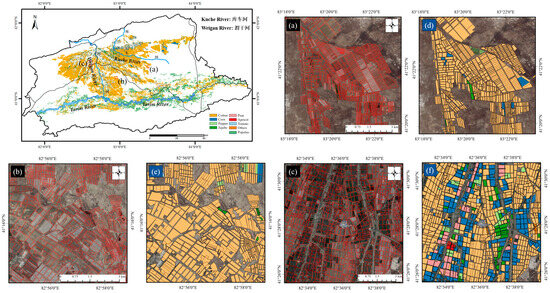 Agriculture is the foundation for socio-economic development and is the comprehensive result of resource utilization and human transformation [1,2,3]. Efficient agricultural water management is unachievable in arid regions with limited water resources. In recent years, initiatives such as permanent basic farmland protection and national standard farmland renovation in China have decreased farmland areas and improved farmland structures. However, considering the actual situation where farmland conditions remain variable, the application of water-saving irrigation techniques and water resource management [4,5] necessitates the rapid and precise updating of crop structures.