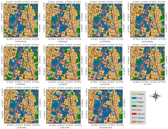 We compared the classification results of multiple time-series models. The models included in the comparison are Transformer [31], Reformer [32], FEDformer [33], Crossformer [34], Dlinear [35], LightTS [36], PatchTST [37], FiLM [38], and TimesNet [39]. The experiment used the same dataset in Section 3.2.2 and retained the model with the highest accuracy after five independent training sessions. The hyperparameter configuration for Bi-LSTM can be found in Section 3.2.2. The remaining models were all set with an initial learning rate of 0.001, a maximum of 100 epochs, a batch_size of 16, a loss function of CrossEntropyLoss, and the optimizer ADAM. The accuracy evaluation metric displayed is the F1 score for each crop category. Additionally, the average F1 and weighted F1 were calculated. The weights for the weighted F1 are as follows: 0.8 for cotton, 0.05 for corn, and 0025 for all other crops.
