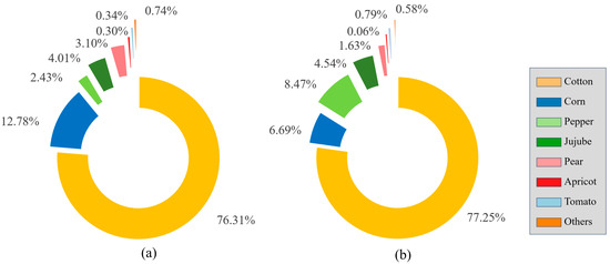 The quantified information of the cropping structure results is given in Table 5. The study area’s agricultural cultivation scale encompasses 5.29 × 105 hectares (hm2), spanning 853,404 parcels. In contrast to the large-scale cultivation observed in corps cities like Shihezi, agriculture in the Weigan River Basin predominantly adheres to a smallholder economy model. The average parcel area is 6202 m2, featuring a smaller area than the Xinjiang Production and Construction Corps’ cropland. This is primarily attributed to the decentralized agricultural operation and smallholder economy prevailing in the county-level area. Regarding the types of crops, the predominant ones in the region are cotton and corn, covering areas of 404,326 hm2 and 66,480 hm2, respectively. Specialized crops include peppers (14,340 hm2) and tomatoes (1871 hm2), while traditional fruit trees such as jujube, pear, and apricot occupy areas of 47,354 hm2, 21,332 hm2, and 4239 hm2, respectively.