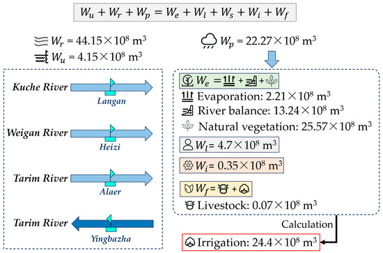 Ecological water consumption comprises evapotranspiration, channel balance, and vegetation-water consumption. Initially, lakes and reservoirs’ evapotranspiration, determined by Penman’s formula [41] based on the watershed area, is 2.21 × 108 m3. River balance primarily encompasses water resources consumed in natural river channels to maintain ecosystem stability and water consumed by the ecological use of channel seepage water by bank protection forests in artificial irrigation canals. Empirical coefficients suggest that 30% of surface runoff is typically consumed for river balance in arid-zone watersheds. Consequently, it can be inferred that river balance consumes a minimum of 13.24 × 108 m3 of water. Due to the continuous decrease in cultivated land area in the middle reaches of the Tarim River over the past five years, ecological conditions have improved. According to the relevant literature, the water consumption of natural vegetation in the Weigan River Basin is estimated to be 25.57 × 108 m3 [42]. In 2020, the total water consumption of the Weigan River Basin, excluding irrigation-water consumption, amounts to about 46.17 × 108 m3. According to the water balance approach, prioritizing ecological water consumption, the irrigation-water supply should be 24.4 × 108 m3. A graphical representation for each term of the water balance, as given by Equation (7), is given in Figure 7.