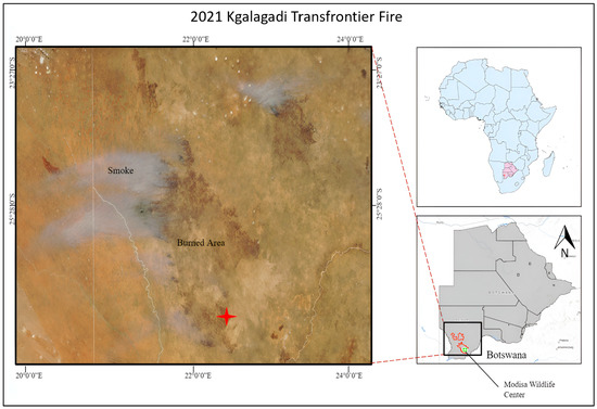 Kgalagadi Transfrontier Fire (KTF) extent and location in Botswana. Modisa is indicated by a red star in the left panel of the figure. The natural color satellite imagery of the Kgalagadi Transfrontier Fire in the left panel was acquired by the National Aeronautics and Space Administration’s (NASA, Washington, DC, USA) Moderate Resolution Imaging Spectroradiometer (MODIS, Washinton, DC, USA) from its Aqua satellite on 8 September 2021 at a 250-m resolution.