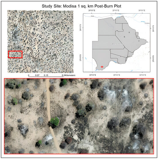 The top left corner depicts the 1 sq. km post-burn plot of land that this study primarily focused on. The bottom panel offers a closer look at the burn impacts within the plot of land. The top right corner displays the location of the study site in Botswana, Modisa and is indicated by a red star.