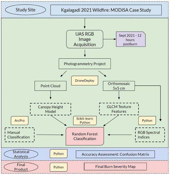 Flow chart showing the steps of the burn severity classification model along with the datasets and software used. R: red; G: green; B: blue; GLCM: gray-level co-occurrence matrix; UAS: unmanned aerial system.