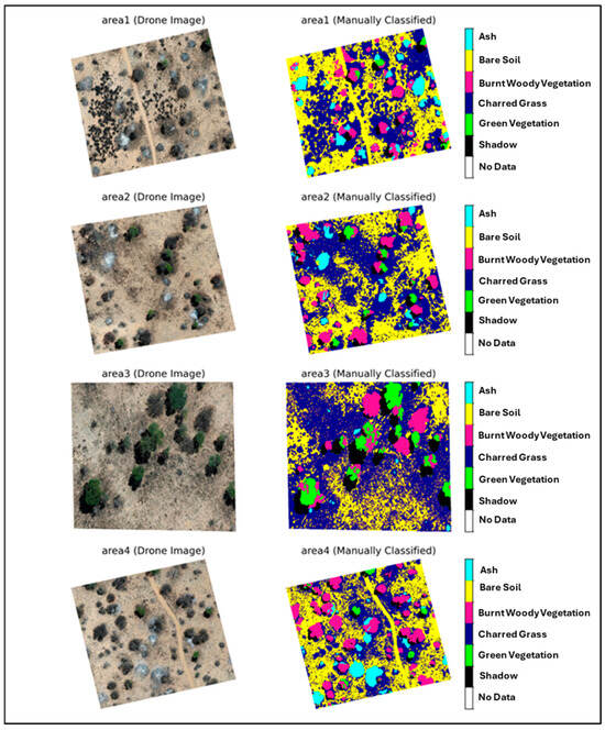 We used six land cover classifications (including shadow’s null classification) with corresponding burn severity rankings (Table 2), including four indicators of burn severity (green vegetation, burnt woody vegetation, charred grass, and ash deposits) that could be easily distinguished within the RGB imagery (Figure 4) [14,25]. Initial model runs were executed using additional burn severity classes, including gray ash, white ash, burnt woody vegetation (minimal charring on trunk), and charred woody vegetation (high levels of charring throughout trunk and branches). These classes were combined to become ‘Ash’ and ‘Burnt Woody Vegetation’ for final model runs, given their similar characteristics that resulted in low levels of class separability and low classification accuracy within the initial model outputs. Burnt woody vegetation was defined as standing vegetation that experienced partial scorching on the trunk and canopy, leading to an overall loss of green vegetation, but received no structural damage. Ash was defined as white ash, which represented fully combusted vegetation with minimal residual organic material, and gray ash, which comprised a mixture of fully combusted vegetation and partially combusted plant material. Charred grass was defined as grass that had been burned, resulting in a blackened appearance due to partial combustion, while retaining some structural integrity, unlike ash. Green vegetation was classified as standing, green woody vegetation that received little to no fire damage. Bare soil was classified as uncharred parts of the bare ground.