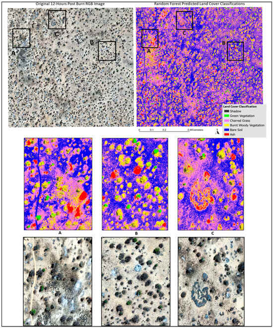 Top Panel: Original drone image 12 h post burn (left) and the Random Forest model-predicted land cover classification map (right). Three outlined regions (A, B, C) are indicated. Bottom Panels: The zoomed-in regions from the model-predicted map and the original RGB map for better visualization.