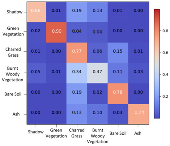 The final RF model was trained using over 20 million pixels, achieving an overall F score of 0.74 and an overall accuracy (OA) of ~79.71%. Green vegetation yielded the highest F1-score of 0.90, indicating a strong concordance between the training dataset and RF-predicted classifications (Table 4). Notably, despite having the smallest sample size (210,213 pixels), green vegetation’s high F1 score underscores the model’s robustness in this class. In contrast, burnt woody vegetation exhibited the lowest performance, with an F1 score of 0.51. The other land cover classes—shadow, bare soil, ash, and charred grass—demonstrated intermediate accuracy, with F1 scores between 0.70 and 0.78 (Table 4). The confusion matrix (Figure 9) reveals the model’s difficulty in accurately predicting burnt woody vegetation, frequently misclassifying it as charred grass. Similar misclassification patterns were observed for shadow, bare soil, and ash, which were often incorrectly classified as charred grass.
