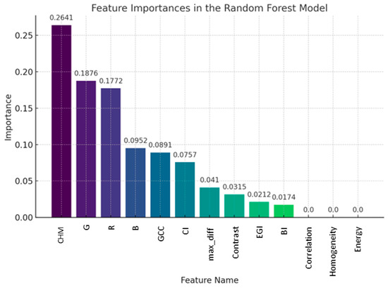 Feature importance within the Random Forest classification model. CHM = Canopy Height Model; RGB = Red band, green band, blue band; GCC = Green Chromatic Coordinate; CI = Char Index; max_diff = Max Difference Index; EGI = Excessive Greenness Index; BI = Brightness Index.