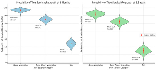 Woody vegetation survival and regrowth. This figure presents the probability of survival and regrowth in woody vegetation at 6 months and 2.5 years post-burn across the 1000 derived Monte Carlo outputs. Mean probabilities and standard deviations are calculated for each category. Wider violin plots indicate a higher likelihood of regrowth, while narrower plots suggest a lower likelihood.