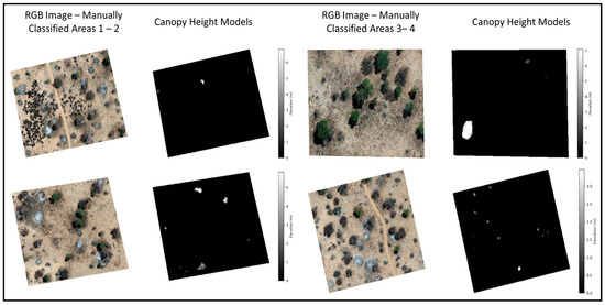 Sample of RGB images used within the manual classification dataset and their corresponding CHM in meters. White spots within the CHM are indicative of taller vegetation.
