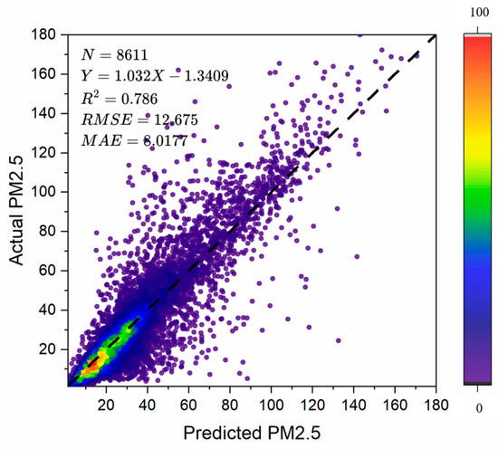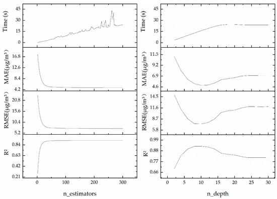 During model training, a consistent random seed was used to shuffle the dataset, minimizing the errors in testing and analysis due to data variability. The optimization process focused on two key parameters, the number of decision trees and the maximum depth of each tree, aimed at enhancing the model’s predictive accuracy. The number of trees was varied from 2 to 300 in increments of 2, while the maximum depth was adjusted from 2 to 30, also in increments of 2. As illustrated in the parameter optimization process (Figure 3), the model’s predictive accuracy significantly increased as the number of trees and the maximum depth rose, particularly when the number of trees was below 14 and the depth was below 6. The computational time exhibited a roughly linear increase with the number of trees, while the relationship with the tree depth was approximately logarithmic. When the number of decision trees approached 200 and the maximum depth reached around 10, the overall model achieved a coefficient of determination (R2) of approximately 0.927 and an RMSE of about 7.42 μg/m3. Further increases in either parameter did not yield significant improvements in the model performance. With this configuration, the computational time was around 17 s. Therefore, in this study, the optimal model parameters were set to a decision tree count of 200 and a maximum depth of 10.