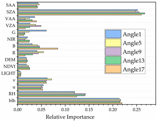 Table 2 presents the descriptive statistics for the input variables in the model. The World Health Organization’s yearly average air quality standard of 5 μg/m3 was greatly exceeded by the PM2.5 concentrations, which ranged from 1 to 172 μg/m3 on average [50]. This indicates that the PM2.5 pollution is quite severe in the study area. Overall, the TOA reflectance observed at angle 9 was the lowest, while angles 1 and 17 recorded higher reflectance values. The average reflectance values in the R band for angles 1, 5, 9, 13, and 17 were 0.1325, 0.1196, 0.1116, 0.1187, and 0.1305, respectively. The patterns for the B, NIR, and G bands exhibited similar trends, with the TOA reflectance initially decreasing and then increasing as the angle varied from 1 to 17. The solar zenith angle (SZA) varied with the seasons, with the maximum values (around 65°) representing winter and the minimum values (around 14°) indicating summer. The solar azimuth angle (SAA) ranged from 120° to 190°, suggesting that the sun was predominantly positioned in the southeast–south direction relative to the observation points, with an average SAA of approximately 160°, coinciding with the GF-5B satellite’s overpass time of about 10:30 local time. The viewing zenith angle (VZA) represents the angle between the line connecting the satellite and the observation point and the vertical normal. For angles 1, 5, 9, 13, and 17, the average VZA values were 59.1°, 44.8°, 31.5°, 44.9°, and 58.1°, respectively, indicating a correlation between the VZA magnitude and TOA reflectance values.
