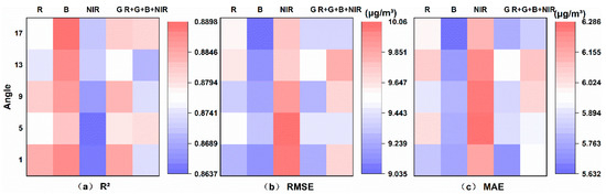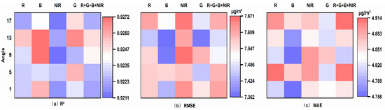 To investigate the influence of different angles and spectral bands on the experimental results, we trained the GBM model using data from angles 1, 5, 9, 13, and 17 across the red, blue, near-infrared, and green bands, as well as a combination of these bands. Figure 5 shows the training results based solely on remote sensing data, without any auxiliary data (including meteorological data, the NDVI, nighttime light data, and digital elevation models). The results indicate that the variation in the R2 values across different angles is minimal, within a range of 0.03, while the differences in the RMSE and MAE are also relatively small, at 1.02 μg/m3 and 0.65 μg/m3, respectively. Notably, the blue band yielded the best inversion performance, exhibiting the highest R2 values (0.8826–0.8898) along with the lowest RMSE (9.03–9.31 μg/m3) and MAE (5.63–5.81 μg/m3). Conversely, the near-infrared band showed the poorest inversion performance, characterized by the lowest R2 values (0.8638–0.8713) and the highest RMSE and MAE values (9.72–10.05 μg/m3 and 6.12–6.29 μg/m3, respectively). For the combinations of the four bands, the R2, RMSE, and MAE values ranged from 0.8701 to 0.8805, 9.41 to 9.83 μg/m3, and 5.83 to 6.09 μg/m3, respectively. This suggests that combining bands does not enhance the inversion accuracy; the performance was only better than that of the near-infrared band, while, overall, it remained lower than that of the other three bands. In summary, the effect of different angles on the inversion performance was not significant in this analysis when only using remote sensing data.