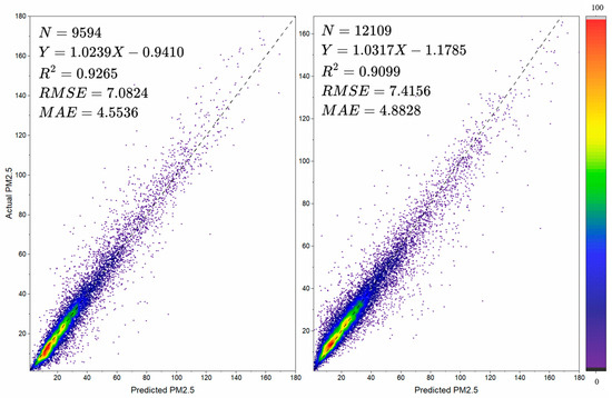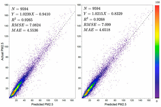 Based on the inclusion of polarization component information, the data were divided into two schemes. Scheme 1 utilized only the I component information from GF-5B at angle 13, and Scheme 2 incorporated both the I and Q component information from GF-5B at angle 13. By comparing the polarization-enhanced Scheme 1 and Scheme 2, we explored the spatial impact of polarization data on PM2.5 estimation. The cross-validation (CV) performance of the models for both schemes is illustrated in Figure 8. The sample size for both Scheme 1 and Scheme 2 was 9594. As shown in Figure 8, the CV R2 and RMSE values for Scheme 1 were 0.9265 and 7.08 μg/m3, respectively. For Scheme 2, the CV R2 and RMSE values were 0.9268 and 7.10 μg/m3. The slopes indicated that we slightly underestimated the PM2.5 values, with slopes of 1.0239 for Scheme 1 and 1.0215 for Scheme 2. This suggests that the results from the GF-5B model incorporating polarization data are closer to the 1:1 line compared to those without polarization data. Overall, the inclusion of polarization components resulted in a minor improvement in the model’s predictive performance; however, the difference in the R2 was only in the order of one ten thousandth, and the RMSE for the model including polarization data was higher than that of the model excluding them. Therefore, to simplify the retrieval, polarization data were not included in subsequent inversions.