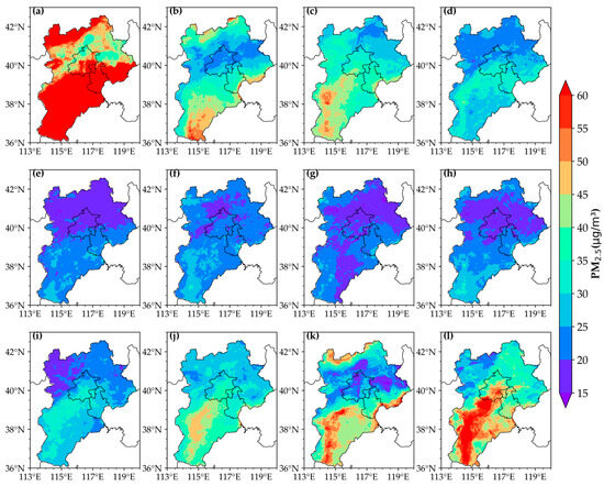 Monthly results of PM2.5 estimation by GF-5B ((a–l) representing January to December).