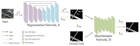 Semantic segmentation techniques in semi-supervised learning can be classified into five categories: generative methods [20,21], consistency regularization methods [22], pseudo-labeling methods [23,24], self-training methods [25,26], and hybrid methods [27]. Generative techniques replicate data distributions and produce pseudo-labels, while consistency regularization techniques utilize unlabeled data to ensure seamless transitions between data points. Pseudo-labeling techniques enhance the training set by incorporating pseudo-labels, and self-training techniques employ the model’s predictions as training data. Hybrid methods amalgamate these approaches to achieve optimal outcomes. Semi-supervised methods tackle the issue of insufficient labeled data by incorporating a small portion of labeled data alongside a substantial quantity of unlabeled data. These techniques can decrease the dependence on labeled data by extracting possible patterns from the unlabeled samples [28]. When there is a substantial amount of unlabeled data and the model can effectively leverage the implicit structural information in both labeled and unlabeled data, the accuracy of semi-supervised learning can be comparable to that achieved by training with extensively labeled data [26]. Ref. [20] employed an adversarial learning structure for semi-supervised semantic segmentation, designing discriminators to distinguish the predicted probability map from the true segmentation distribution. Ref. [29] proposed a two-branch semi-supervised semantic segmentation method using generative adversarial networks. Ref. [25], on the other hand, introduced self-training methods in semantic segmentation networks to generate high-quality pseudo-labels for unlabeled samples. These approaches leverage the strengths of semi-supervised learning by enhancing the model’s ability to learn from a combination of labeled and unlabeled data, ultimately improving the accuracy and robustness of the road extraction process.