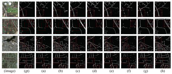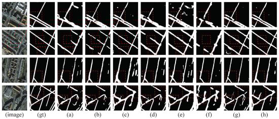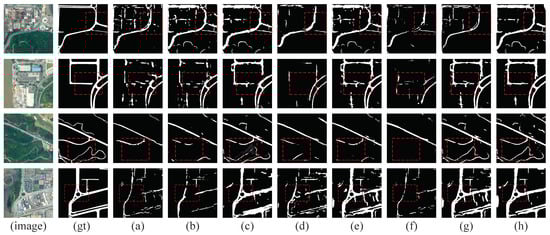 A red dashed box is used in the experimental results graph to mark the parts where the effect is obvious. As shown in Figure 3, our method works significantly better in mountainous areas with some long and thin road segments, especially in terms of road continuity. Furthermore, as compared to other approaches, our method is more comprehensive in its extraction of the road as a whole, recognizing more complete and continuous road information.