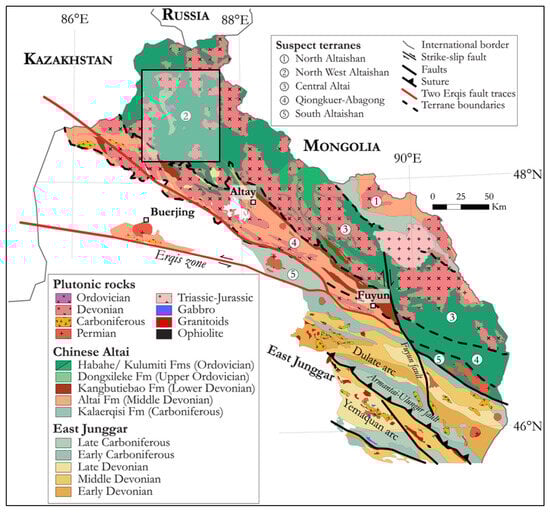 - Dong, Z. Paleozoic Geological Evolution of the Chinese Altai Orogen in the Fuyun-Qinghe Region: Constraints on the Accretionary Orogenic Processes of the Paleo-Asian Ocean. Ph.D. Thesis, Northwest University, Xi’an, China, 2021. [Google Scholar]