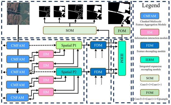 Figure 1. SPFDNet mainly consists of a chunked multi-scale feature aggregation module (CMFAM), an information interaction module (IIM), a feature decoupling module (FDM), and an integrated expansion recoupling module (IERM).
