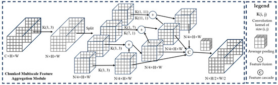 Figure 2, CMFAM mainly consists of multiple convolutional blocks, considering the balance between accuracy and efficiency. The dimension of the input features is adjusted by the first 3 × 3 convolution. Then, the output features are divided into four identical dimensions. The first and second dimensions are extracted by 3 × 3 convolution of features and fused with the next dimension. Considering that the water bodies are fine tributaries and large-scale lakes, the features are extracted in the last two dimensions with convolution kernel sizes of 1 × 7, 7 × 1 versus 1 × 11, 11 × 1, respectively. Finally, the partitioned features are cascaded.