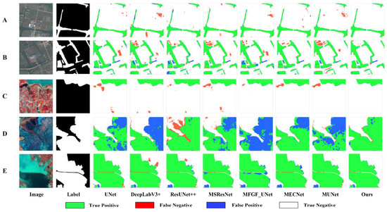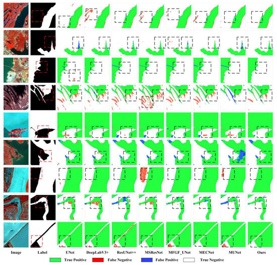 Figure 11. ResUNet++ and MSResNet show a strong contrast in the prediction results of the two datasets. They correctly recognize water bodies, while too many of the background elements are judged as water bodies. UNet and DeepLabV3+ are traditional deep learning algorithms, which are difficult to adapt to the environment of water body recognition, so the results are a little inferior. MECNet and the proposed method show strong stability in both data sets. Benefiting from the reinforcement and supervision of decoupled features, this paper can better distinguish the boundary and background information while extracting water body features.