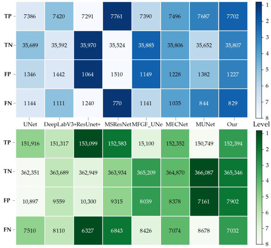 TP denotes the total number of pixels correctly predicted as water bodies, and TN denotes the total number of pixels correctly identified as background. FP denotes the total number of pixels incorrectly identifying the background as a water body. FN denotes the total number of pixels incorrectly identifying the water body as the background. The difference in the values is large because the two datasets differ in the number of samples and the percentage of water bodies, as can be seen in