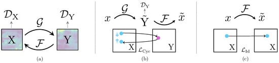 Graphical representation of the original CycleGAN architecture presented in [41]: (a) the architecture design and relationships; (b) the cycle loss ; (c) the identity loss . (b,c) refer only to the loss terms related to the domain; refer to (2) and (3) for more details. In (b), indicates that, by applying the mapping function to , we aim to find an approximation of the -domain distribution, i.e., . The same holds for , where the mapping function aims at finding a proper approximation of the -domain distribution. The optimal and mapping functions translate the domains and to domains and that exhibit the same distributions of and , respectively.