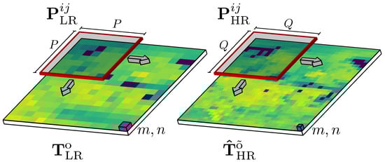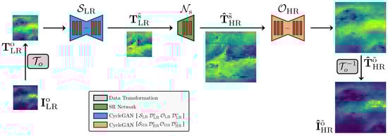 where the operator is a data transformation applied to LR emissions [81,82], is an NN architecture for SR [83], and is the inverse transformation operator of . The , , and operators were learned from a training set of -only emissions. This means the network was tailored to the domain of data under investigation, i.e., the domain .