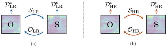 In particular, the operator is part of the CycleGAN architecture used at step 2 of our proposed pipeline. As specified in Section 4.2, two GANs are needed for implementing a single CycleGAN framework. Therefore, even if from a practical viewpoint we need only the and operators for mapping LR data from the to the domain (step 2 of our proposed pipeline) and HR data from the to the domain (step 4 of our proposed pipeline), we must also include the operator (mapping to ) and (mapping to ) in loss implementation (for a more in-depth explanation, see Appendix A).