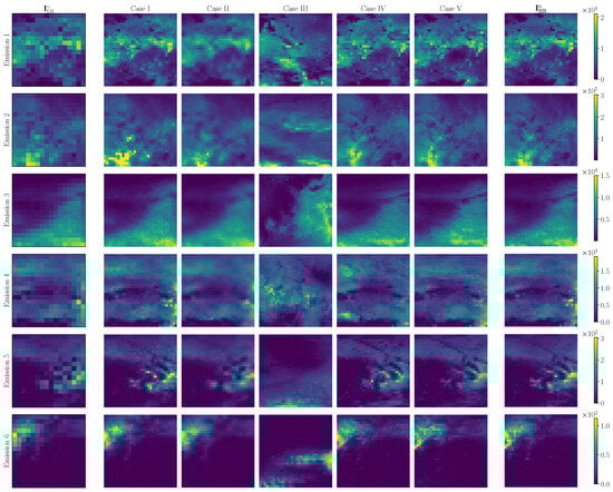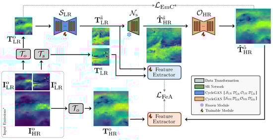 - Emission adaptation . After the SR in the domain, we perform an inverse adaptation operation to convert HR emissions in the domain. Therefore, the super-resolved emission is processed by applying an inverse mapping function . Computing , we return to the initial domain of the emission map (). In this case, also indicates an approximation of the domain. For emission maps in Figure 3, we can notice the spatial and numerical difference between the (source) and (target) domains of the generator.