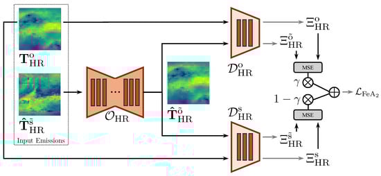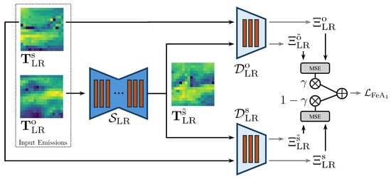 To enforce the map translation consistency between the two domains, inspired by [65], we design an additional loss component that acts directly on the latent representation of the emission maps [65,84]. With this loss, we aim to minimize the feature distribution shift between the and domains at different spatial resolutions. Specifically, the feature alignment (FeA) loss is designed to force feature alignment between the two domains before and after the SR process. This is achieved by minimizing the distance between features extracted from the discriminators associated with the GAN architectures included in our model. We refer to these elements as feature extractors in Figure 5 since the feature extraction is performed from the next-to-last layer of the discriminators. The color coding of these modules emphasizes the additional data diversity of the two CycleGANs (the one that deals with the LR and the other with HR emissions).