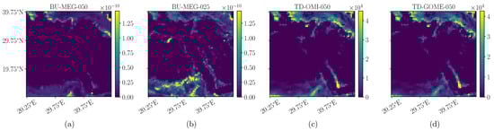 For example, Figure 1 depicts two BVOC emission maps (isoprene species) related to the same geographical area but from different domains, i.e., (BU—numerical simulations) and (TD—satellite observations). A smoother behavior of the emissions is noticeable with respect to the emissions, which present higher spatial frequency content. Notice also the differences in the dynamic ranges.