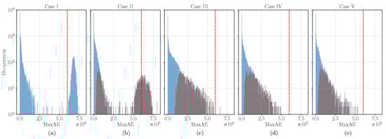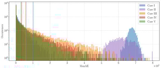 where m and n denote the pixel coordinates of the considered image. Therefore, MaxAE measures the largest error in the super-resolved image compared to the ground-truth .