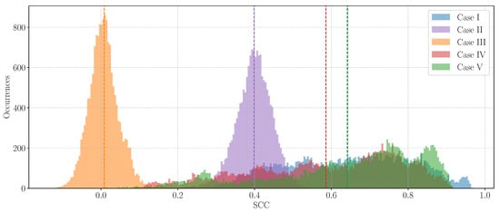 The spatial correlation coefficient (SCC) [93] measures how closely the super-resolved image matches the spatial patterns of the ground-truth . It ranges from −1 to 1, where 1 indicates perfect correlation, 0 indicates no correlation, and −1 indicates perfect anti-correlation or dissimilarity. It is computed by applying a high-pass filter to both the predicted and target images, calculating local variances and covariances, and then, analyzing the correlation of these features.