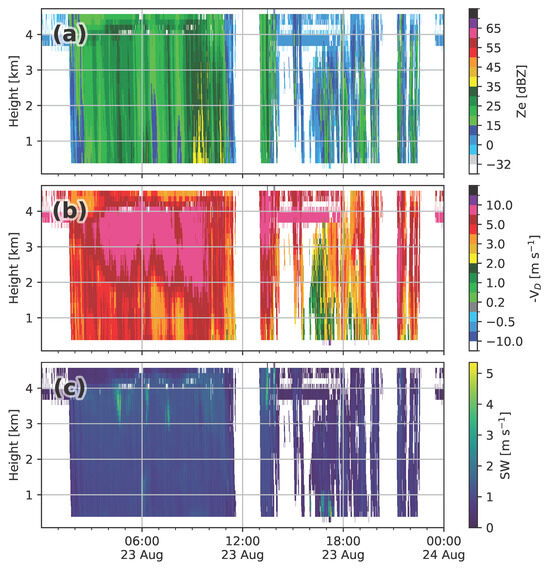 Time–height diagrams of MRR-2 data for the ICN site on 23 August 2021: (a) reflectivity, (b) Doppler velocity, and (c) spectrum width.