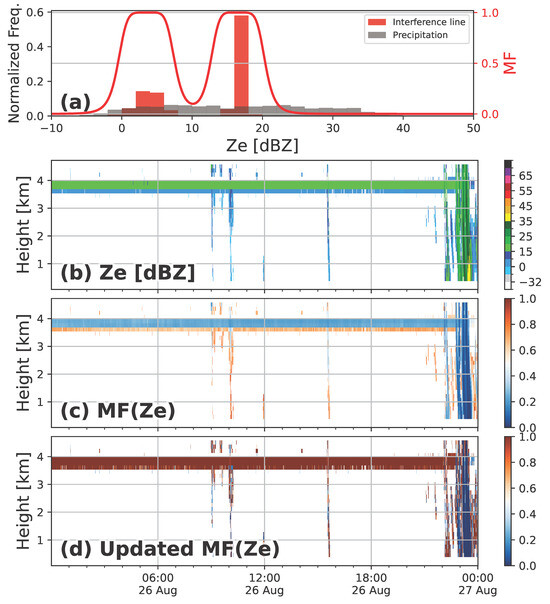 (a) Similar to Figure 3 but showing interference line and precipitation candidate samples obtained from (b) and the updated reflectivity membership function. Time–height diagrams for the ICN site MRR-2 on 26 August 2021: (b) Ze, (c) MF(Ze), and (d) updated MF(Ze).