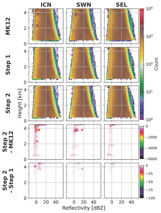 The CFADs for ICN and SWN revealed that more than 1000 spurious counts, resulting from interference lines, were identified at altitudes exceeding 3.5 km and at ~2.3 km. At ICN, these interference lines extended to higher altitudes, affecting the maximum range gates within the −5 to 10 dBZ interval. In contrast, at SWN, the interference lines impacted altitudes up to 4 km, influencing three different reflectivity ranges near 0–10 dBZ and 17 dBZ. These signals were completely eliminated after Step 1, enabling us to interpret the CFAD with meteorological signals only. Despeckling (Step 2) produced minimal changes from the CFAD after Step 1, with differences of fewer than 30 counts. The difference between Step 2 and MK12 indicated that approximately 1000 to 4000 spurious signals were identified and removed. The CFAD for the SEL site showed very few signals associated with interference lines (at 1.8 km, 2.3 km, and 4.2 km), all of which were removed. What we would like to highlight is that the algorithm showed good performance even at the independent SEL site, which was not included during the development of the algorithm.