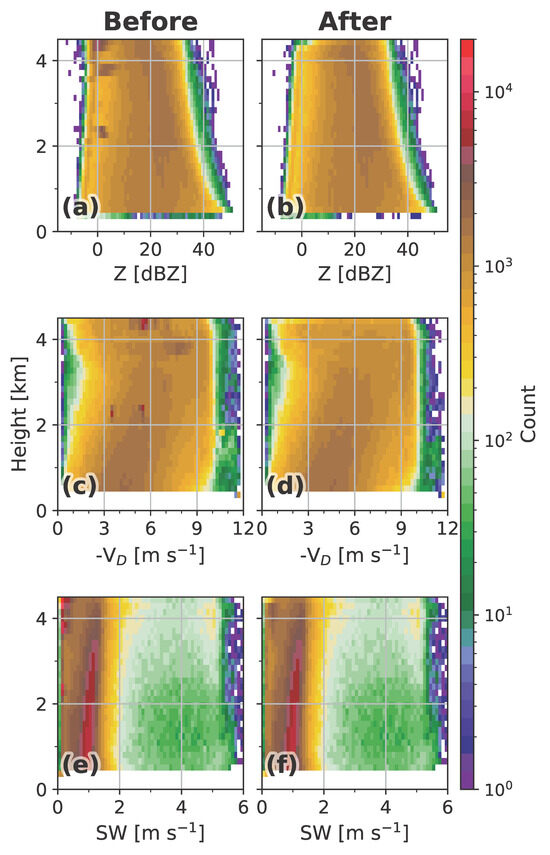 CFADS of (a,b) reflectivity, (c,d) Doppler velocity, and (e,f) spectrum width for ICN site. Similar to Figure 5, each column represents the data before (denoted as “Before”, corresponding to the data after the MK12 algorithm) and after applying the algorithm (denoted as “After”).