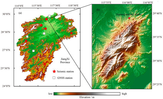 (a) The distribution map of geophysical observation stations in Jiangxi Province, China, with red pentagrams representing seismic deformation stations and white squares representing GNSS observation stations. (b) Topography of the Jiujiang seismic station (JSS), with red pentagrams representing JSS. In (a,b), the colors represent elevation, with green indicating plains and brown representing mountainous areas.