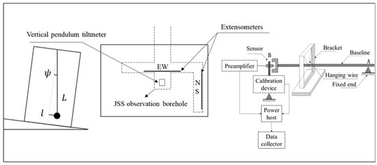 The extensometers and tiltmeter at JSS observation borehole. The central box represents the JSS observation borehole, with the observation principles of the extensometer on the right and the vertical pendulum tiltmeter on the left.