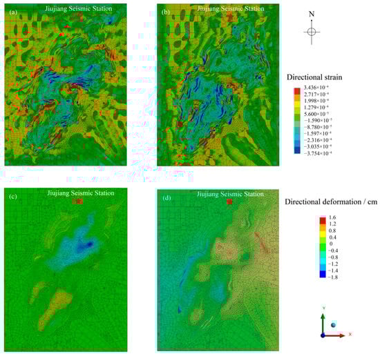 Figure 6c,d show the deformation solutions in the NS and EW directions, respectively. The 3D geological FEM simulates deformation magnitudes in the range of −1.8 to 1.6 cm. Influenced by factors such as gravity, temperature, topography, and geological structures, the deformation in the NS and EW directions differs significantly. In Figure 6c, the NS deformation solution is predominantly negative, indicating that the mountain exhibits a southward tilting deformation. In Figure 6d, the EW deformation solution reveals a NE-SW extension, aligning with the general extension direction of the Lushan Mountain range. The northwestern part primarily shows negative EW deformation, while the southeastern part shows positive EW deformation, suggesting that the northwestern region tilts westward, while the southeastern region tilts eastward. Since JSS is located in the northwestern (NE) part of the study area, which experiences westward and southward deformation, it can be inferred that JSS as a whole exhibits a southwestward (SW) deformation trend.