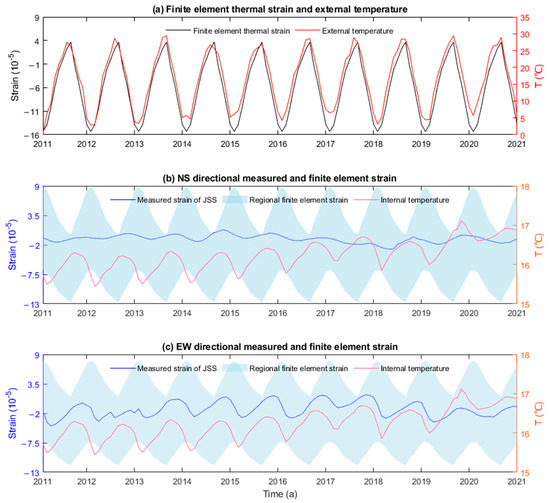 Comparison of the 3D geological FEM strain with the measured strain at JSS over a ten-year period from 2011.0 to 2021.0. (a) FEM thermal strain and external temperature at JSS. (b) Comparison of the NS directional regional FEM strain with the strain measured at JSS. (c) Comparison of the EW directional regional FEM strain with the strain measured at JSS. (b,c) also show the relationship between the strain and the internal temperature observed in the JSS observation tunnel.