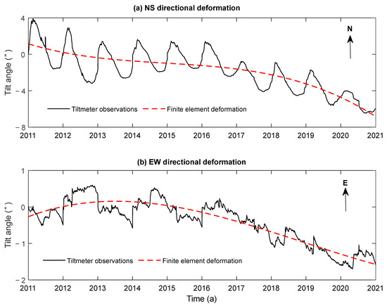 Figure 8 presents the deformation data in the NS and EW directions, respectively. The deformation data are derived from the 3D geological FEM results and tiltmeter observations. As shown in Figure 8a, the annual variation trend of the observed NS directional deformation indicates a tilt toward the south. Similarly, Figure 8b demonstrates that the annual variation trend of the observed EW directional deformation indicates a tilt toward the west. The annual deformation trend observed by the JSS tiltmeter shows an overall tilt toward the southwest, which is consistent with the results of the 3D geological FEM. The correlation coefficient between the deformation observed by the JSS tiltmeter and the FEM simulation is 0.8 in the NS direction and 0.9 in the EW direction, suggesting that the deformation results from the 3D geological FEM can reasonably represent the actual tilting observed by the JSS to some extent.
