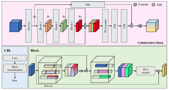 of which, . To distinguish the inputs, and are the spatial dimensions of the generated feature maps. The block design follows the SCConv, followed by a ReLU layer to prevent gradient diffusion. A cascade of two attention modules follows combined with a residual connection to obtain the final refined feature map to prevent gradient disappearance. The block structure can be expressed as