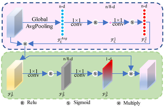 The channel attention layer can make full use of the relationship between the remote sensing image channels, and the pixel attention layer can focus on the features of each pixel point, which is more flexible in an actual scene where the fog concentration is not uniform. Figure 3 shows the whole structure. Suppose that the input feature map is :