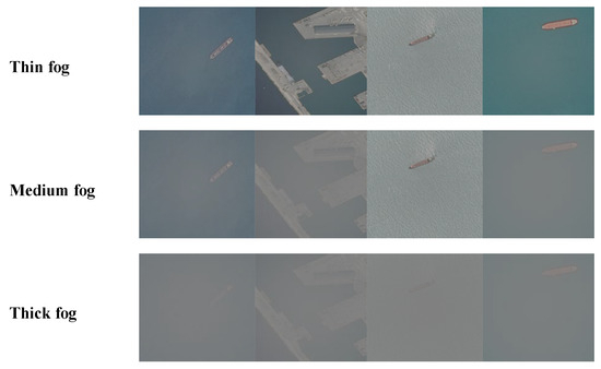 Because the size of the fog-conditioned ship dataset itself is relatively small and deep learning relies on ample training samples to achieve improved results, constructing the dataset needed for training is also a critical task. Most studies have used synthetic fog to construct fog datasets, and some researchers have used a method to synthesize fog images based on a standard optical model (center-point synthetic fog), which is applicable to a variety of atmospheric conditions and scene types. Regardless of whether the indoor or outdoor scenes are mountainous or urban, the standard optical model can effectively simulate the light propagation and scattering processes in the atmosphere and generate realistic fog effects. Center-point synthetic fog can simulate the fog concentration change according to the distance and depth of different areas in a scene based on optical physics, simulating the propagation and scattering process of light in the atmosphere. Therefore, the synthesized fog images in our study were closer to the real fog phenomenon and had a higher physical accuracy.