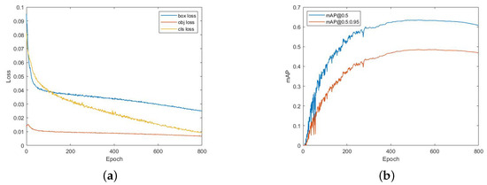 To assess the generalization capabilities of the proposed model, an in-depth investigation of the dataset was conducted. In this analysis, the proposed model was compared with several baseline detectors, namely Faster R-CNN, SSD, FSAF [57], RepPoints [58], YOLOF [59], YOLOv5s, YOLOv6s [60], and YOLOv8n. All the experiments were conducted under identical training settings to ensure a fair and unbiased comparison. The training curve of our method is shown in Figure 6. Regarding the hyperparameters, the learning rate was configured to 0.1, the batch size was set to 10, and the training epochs were set to 800. Notably, these configurations were employed without utilizing a pre-trained model, necessitating the commencement of training from scratch.