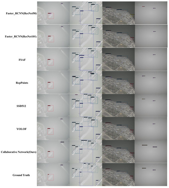 The results in Table 3 show that with the increase in haze thickness, the mAP of all detection methods shows a decreasing trend, which is in line with the objective cognitive law. Additionally, the performance of different detection methods in a haze environment varies significantly, among which YOLOv6s performs the most poorly under the thick haze condition, with an mAP of only 24.5%, indicating that the robustness of its detection is poorer under foggy conditions. Moreover, the proposed collaborative network performs optimally in all fog conditions, with mAP reaching 49.1% in thin-fog conditions, 47.4% in medium fog, and maintained at 41.3% in thick fog conditions. The overall performance is significantly better than the other methods, especially in thin- and medium-fog environments. In thick fog, the proposed model still outperforms the detection accuracy of other models under the same conditions.