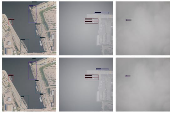 In the first column of Figure 7, the fog concentration is categorized as moderate. Among the detection models examined, FSAF, RepPoints, and SSD failed to detect smaller motorboats. Faster R-CNN, however, exhibited false-positive detection. In contrast, both YOLOF and the proposed model demonstrated accurate performance in detecting the objects of interest. The second column in Figure 7 presents a scenario with a large number of targets. The Faster R-CNN, FSAF, and RepPoints models failed to detect the targets in the upper-left corner. In addition, both the SSD and YOLOF models exhibited false-positive results.